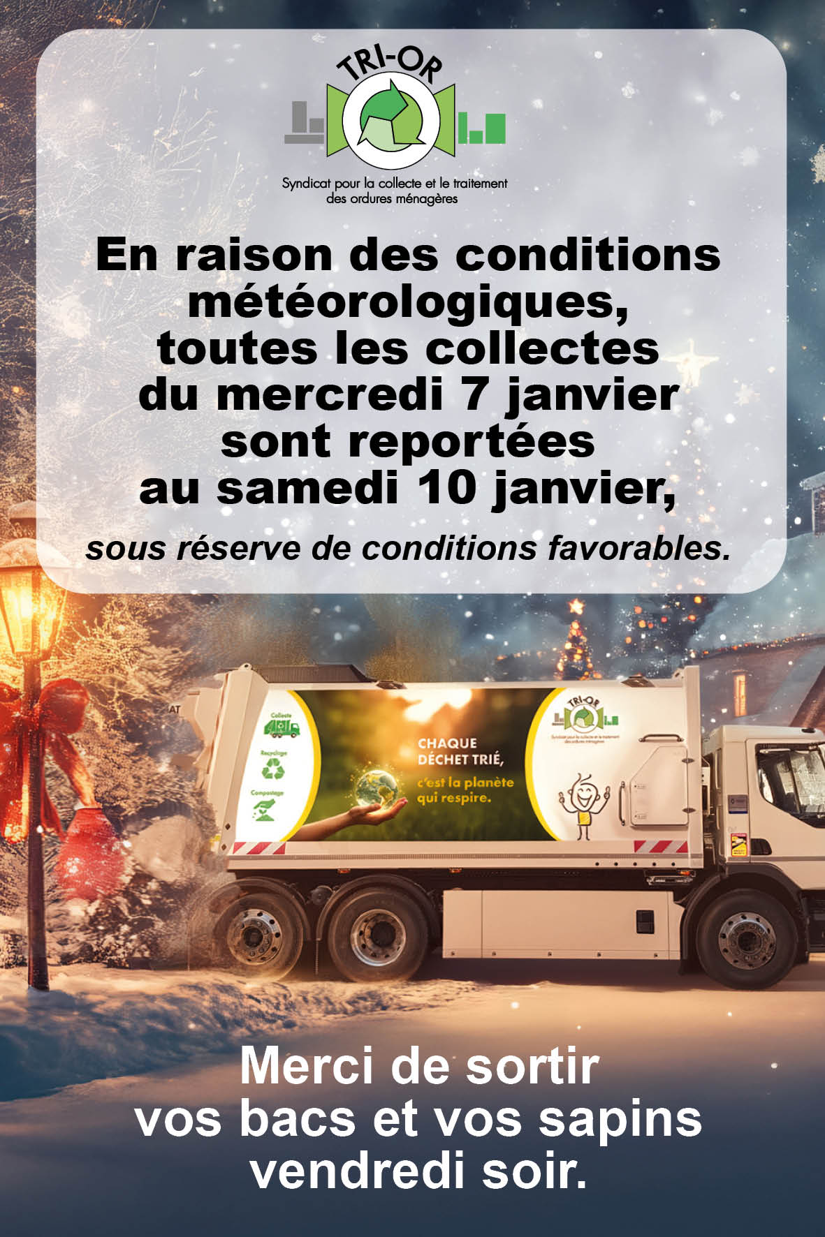 En raison des conditions météorologiques, toutes les collectes du mercredi 7 janvier sont reportées au samedi 10 janvier.