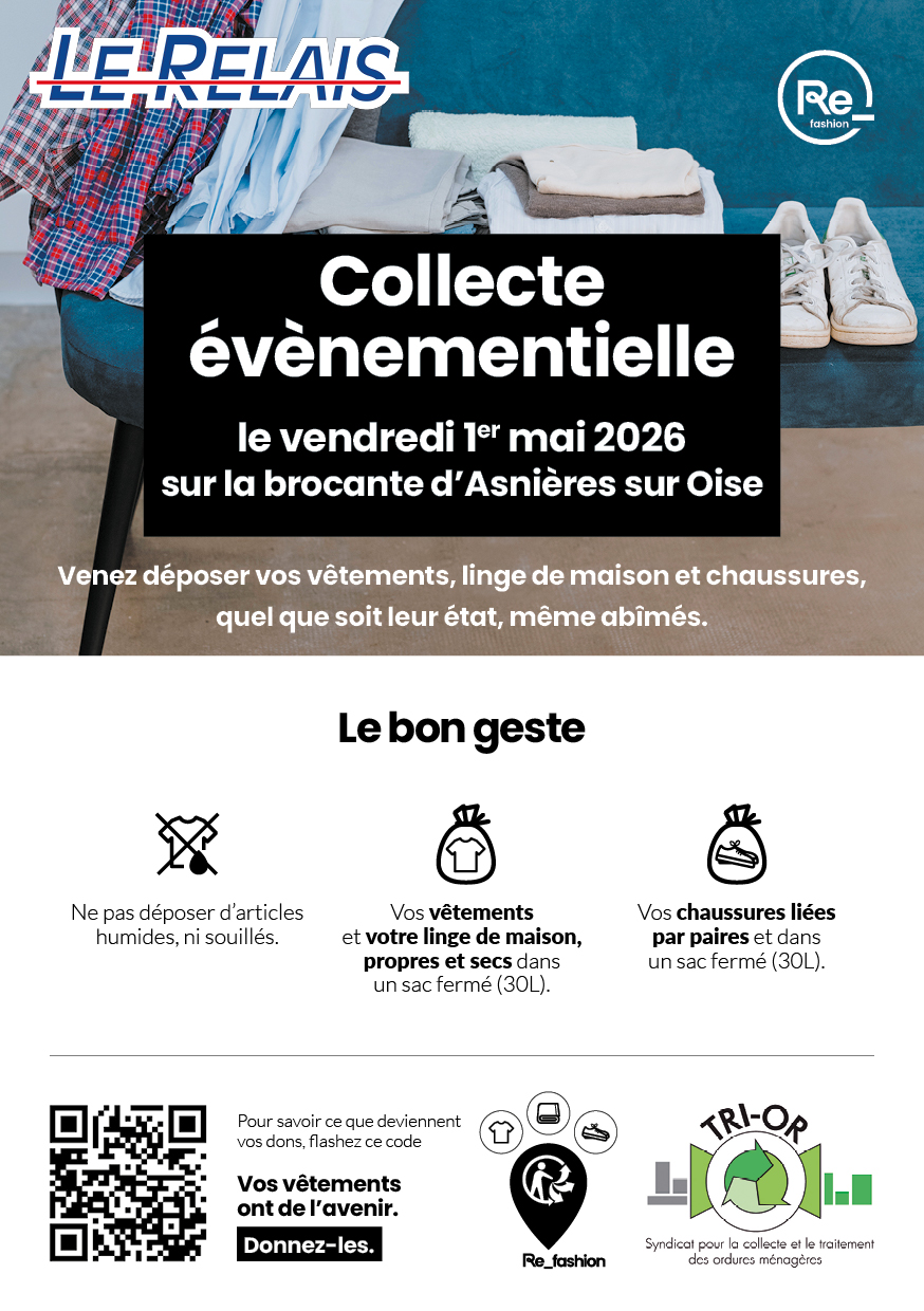 A cette occasion, les vêtements, le linge de maison, les chaussures et les accessoires de maroquinerie invendus pourront être donnés au Relais Val de Seine. Une collecte est organisée par Anim’Asnières pour que les exposants puissent faire don de ce qu’ils ne souhaitent pas garder à l’entreprise solidaire.